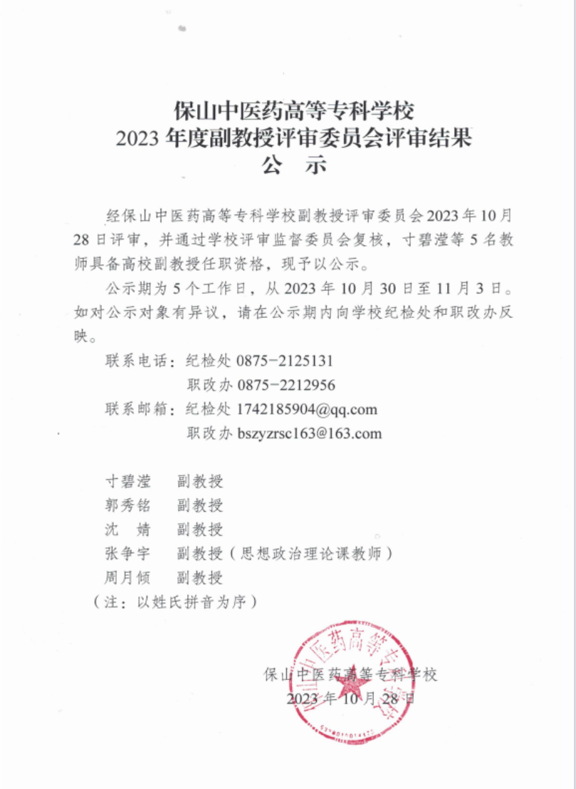 保山中医药高等专科学校2023年度副教授评审委员会评审结果公示