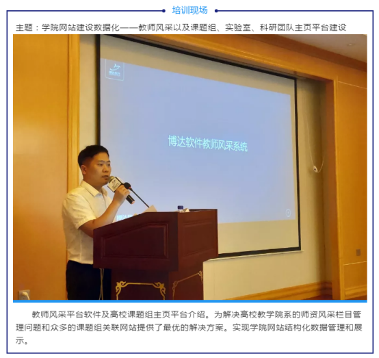 此次培训班开班仪式由博达软件副总经理王总表达对老师们一如既往支持的感谢。王总提到,博达软件于今年正式推出全新的全媒体产品,并在很多高校进行应用实践。博达软件定位为大型组织内容管理与智能服务提供商,博达的发展离不开各高校老师的长期支持,建设下一代网站群是博达的目标,为高校提供更安全、更智慧、更高效的服务是博达持续发展的动力。
