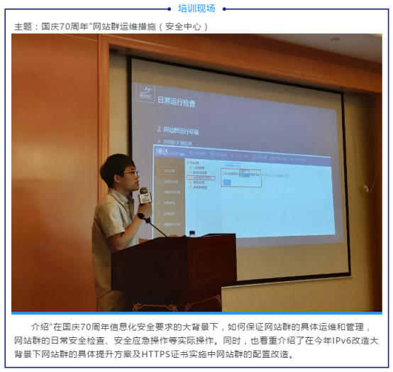 8月15日,为期4天的培训班圆满结束。通过此次培训,老师们对以下内容进行了充分并全面的了解和掌握:高校网站群发展现状及发展趋势;网站群日常运行检查,安全应急操作,国庆期间网站安全保障;响应并落实工业和信息化部关于开展2019年IPv6网络就绪专项行动的号召,进行网站群IPV6、HTTPS改造知识的普及;博达相关产品如教师风采平台软件等。