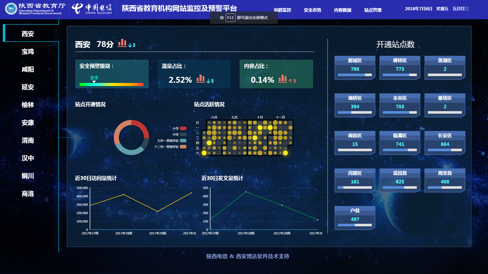 博达软件联手中国电信,为陕西省教育厅部署统一的校园网站监控及预警平台,将全陕西省近840个学校站点,进行统一收录,实现了对全陕西省的高等院校、中小学网站的全面监控和预警,并且,平台集成了入侵防护日志统计、全省攻击范围对应地图位置显示以及对与每日监控类型的多图标统计分析等功能,全面的解决了全省近千家教育机构网站无法统一监控与维护的难题。